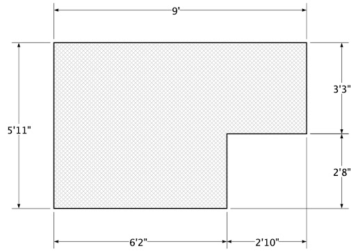 This is a custom net that is 5′-11″ X 9′ with a corner notch area that is 2′-8″ X 2′-10. The netting type used for this product was the #72 X 1-3/4″ knotted nylon, provided in a diamond mesh pattern, with a 5/16″ Dacron® rope bordered edge. The notch design in this net was needed so that the netting could be installed within an empty space around a door area within a framing structure, and the netting is intended to block and contain baseballs and softballs.