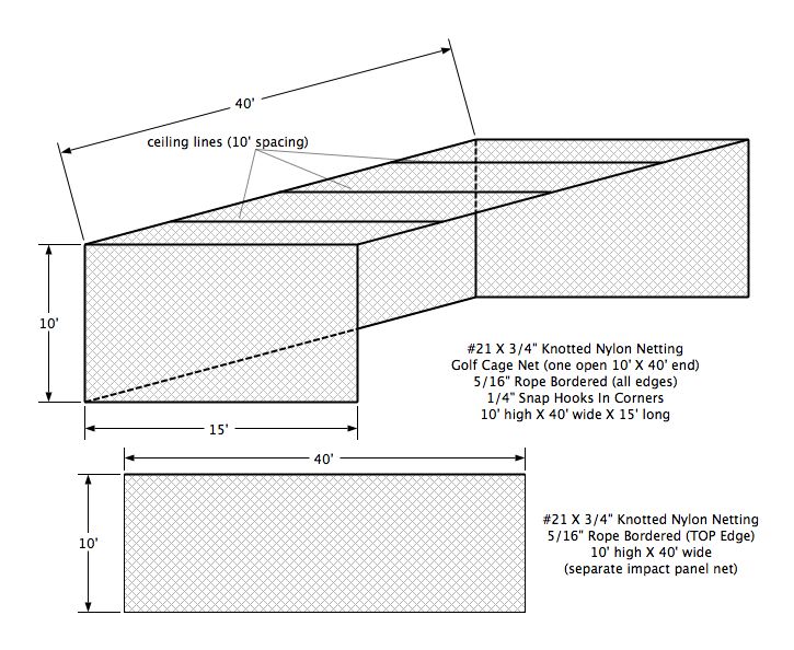Secondly, here’s a custom netting production for a commercial application located on a new country club facility. Kind of an “opposite” situation compared to the net noted before, because this one is an extra-large golf driving cage for multiple people at once (as opposed the the small-space single person use on the first net). So you can get a pretty good idea that no matter whether you need to take a normally large scale application an make it small (like a batting cage net), or a typically smaller scale application and make it jumbo sized (like a golf cage net), Gourock.com can facilitate and supply to any dimensions that you prefer! As mentioned, the below netting enclosure was for commercially oriented golf hitting/driving use for 3-4 users at a time, in an outdoor installation. Measuring 10′ high X 40′ wide X 15′ deep (with one ‘open’ end to be hitting from), this custom net and impact panel are being installed by the customer underneath tensioned steel cables and permanently-set steel poles. Some notable features of this custom golf net are: