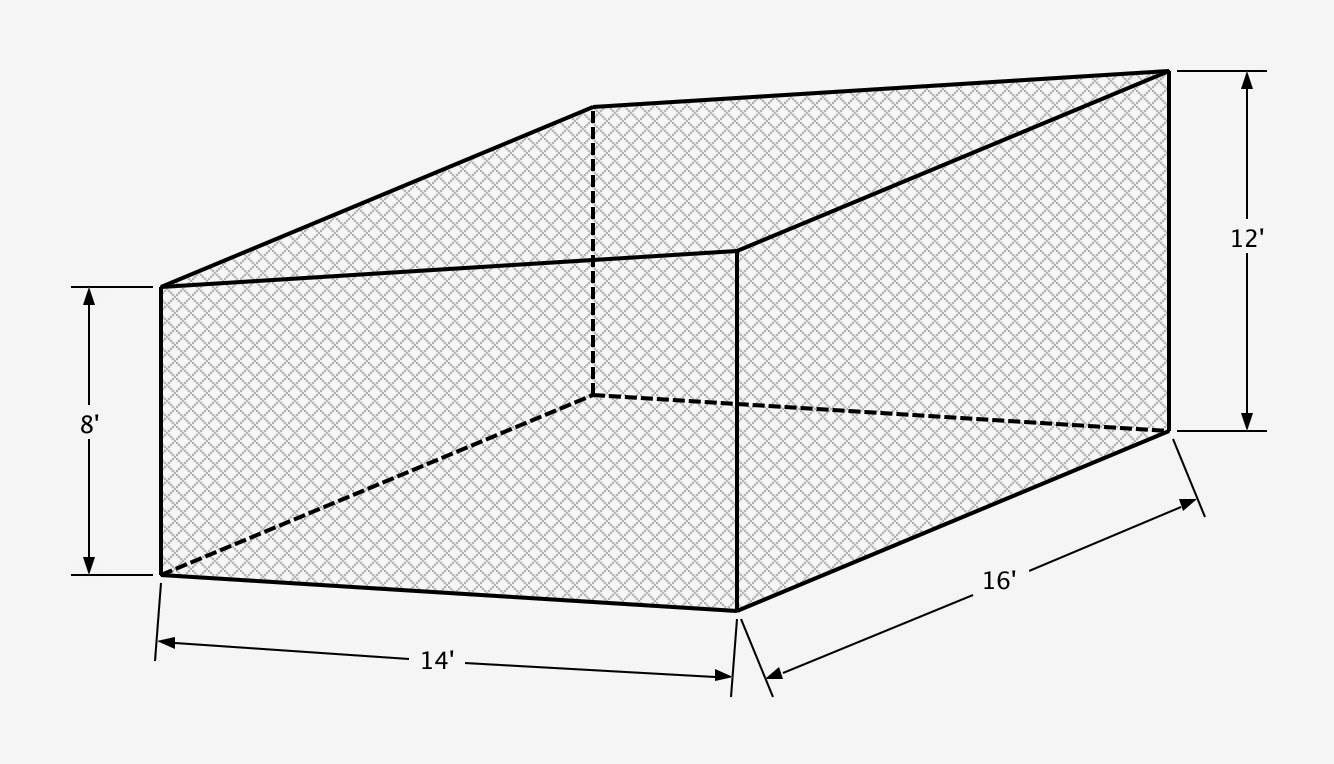 Sizing: (12’/8’) high X 16’ wide X 14’ long (height is 12’ in front, and tapers to 8’ tall in back)